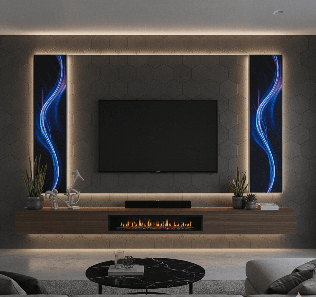TV & Fireplace + Bespoke side shelving with LED mood lighting.